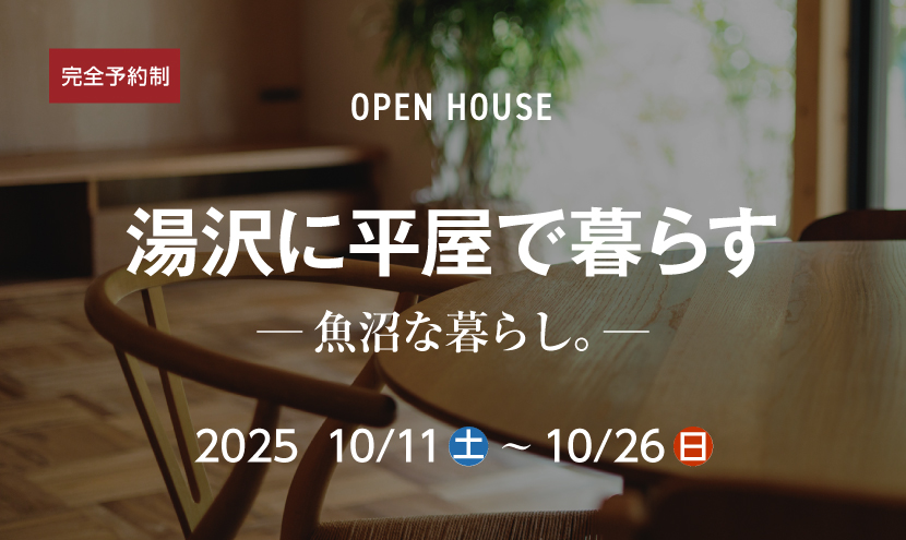 オープンハウス 2025年10月11日(土)〜10月26日(日) 【完全予約制】特別内覧会湯沢に平屋で暮らす‒魚沼な暮らし。‒ 自然と近い暮らしを体感しませんか。 全国でも有数の豪雪地域「南魚沼郡湯沢町」 湯沢も魚沼地域ならではの四季がはっきりしたところ。 今回は「湯沢に平屋で暮らす」と題し 自然と近い暮らしをご提案いたしました。 平屋ならではの動線計画はもちろんのこと 外と内をほどよく繋げ、暮らしに潤いを。 スペックは 最高の「HEAT20 G3」仕様 気密性能もC値:0.21 耐震等級は最高の「等級3」 寒い湯沢でも床下エアコン1台であたたかな暮らし。 雪処理は井戸水消雪で母屋と車庫を消雪する。 外観はフラワーホームがお勧めする「魚沼杉」の縦張り。 地域にちゃんと馴染み、時代が過ぎてもステキな外観に。 フラワーホームが提唱する「魚沼な暮らし。」を 存分に体感していただける完成見学会となっております。 朝晩はめっきり涼しくなってきましたね。 この機会にぜひ。 日にち:2025年10月11日(土)〜26日(日) ※2週間限定 時 間:①10:00〜 ②13:00〜 ③15:00~ ※各時間帯2組まで 会 場:湯沢町(湯沢駅から車で1分) ※完全予約制での開催です。 ※ご予約をいただいた方に会場mapをご案内いたします。 ※定員に達し次第締め切らせていただきます。 ※ご予約はHP・Instagram・お電話からお願いいたします。 見学建物の詳細はInstagramから随時アップします。 https://www.instagram.com/flowerhome_10city ご予約申込み 必須 お名前 必須 フリガナ 任意 郵便番号 必須 住所 必須 電話番号 必須 メールアドレス 必須 ご希望の日程 ご希望の参加日、又はお時間をご記入ください。会場が複数ある場合は、ご希望の会場もご記入ください。 必須 参加人数 大人のみの場合は子供の欄に「0」をご入力ください。 大人 名 小人 名 上記内容でよろしければチェックを入れ、送信してください。 確認画面は表示されませんのでご注意ください 看護学生(女性)限定シェアハウス