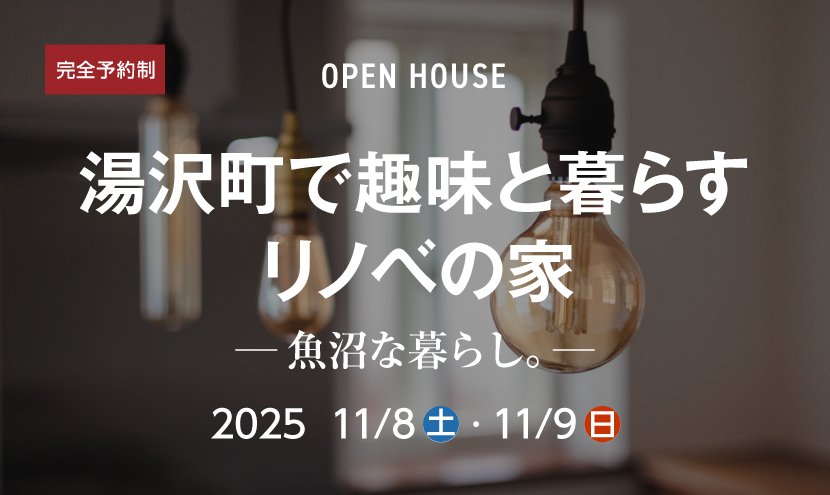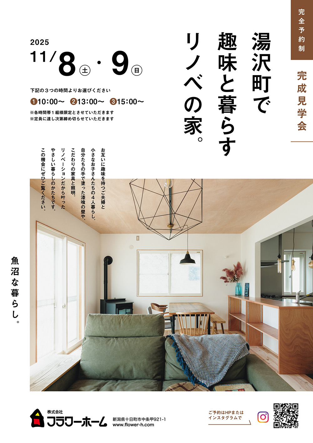 オープンハウス 2025年11月8日(土)・11月9日(日) 【完全予約制】特別内覧会湯沢町で趣味と暮らすリノベの家‒魚沼な暮らし。‒ リノベーションで見つけた自分たちらしさのある暮らし。 お互いに趣味を持つご夫婦と 小さなお子さんたちの4人暮らし。 星、雪、風景と人。 この町ならではの風景をカメラで切り取るご主人の写真は どこか懐かしく、あたたかく、感動的。 大きな雲の下、虫取り網を持って駆け回ったり、 桜道を大冒険するかのようにお散歩してみたり…。 そんなお子さんの写真や、冬の夜空を写した写真を見ていると この町の豊かさを感じられます。 今回見学会を行う住まいは そんな湯沢町で出会った中古の一軒家。 自分たちらしく、ほどよく手をいれた リノベーション物件です。 自ら施工した壁塗り。 お気に入りの照明や家具、そしてペレットストーブ。 そして、絵がご趣味の奥さん専用アトリエもあるんです。 リノベーションだから叶った やさしい暮らしのかたちです。 この機会にぜひご覧ください。 日にち:2025年11月8日(土)・9日(日) ※2日間限定 時 間:①10:00〜 ②13:00〜 ③15:00~ ※各時間帯1組限定 会 場:湯沢町 ※完全予約制での開催です。 ※ご予約をいただいた方に会場mapをご案内いたします。 ※定員に達し次第締め切らせていただきます。 ※ご予約はHP・Instagram・お電話からお願いいたします。 見学建物の詳細はInstagramから随時アップします。 https://www.instagram.com/flowerhome_10city 詳細はこちら(PDF) ご予約申込み 必須 お名前 必須 フリガナ 任意 郵便番号 必須 住所 必須 電話番号 必須 メールアドレス 必須 ご希望の日程 ご希望の参加日、又はお時間をご記入ください。会場が複数ある場合は、ご希望の会場もご記入ください。 必須 参加人数 大人のみの場合は子供の欄に「0」をご入力ください。 大人 名 小人 名 上記内容でよろしければチェックを入れ、送信してください。 確認画面は表示されませんのでご注意ください 看護学生(女性)限定シェアハウス