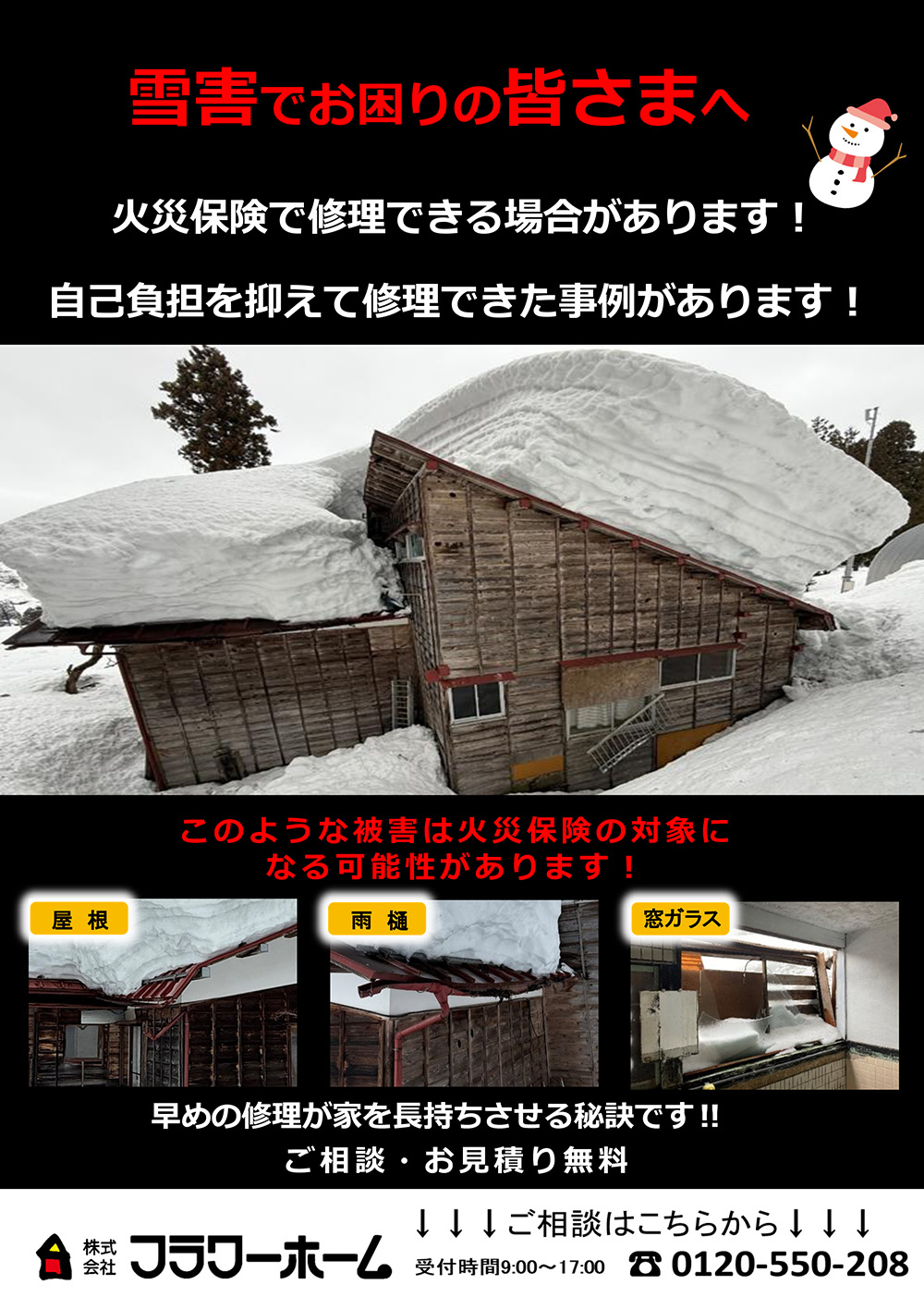 セミナー・ご相談 2026年3月1日(土)〜3月31日(火) 雪害でお困りの皆様へ 火災保険で修理できる場合があります! 自己負担を抑えて修理できた事例があります! 早めの修理が家を長持ちさせる秘訣です!!ご相談・お見積り無料 アクセスマップ 詳細はこちら(PDF) ご予約申込み 必須 お名前 必須 フリガナ 任意 郵便番号 必須 住所 必須 電話番号 必須 メールアドレス 必須 ご希望の日程 ご希望の参加日、又はお時間をご記入ください。会場が複数ある場合は、ご希望の会場もご記入ください。 必須 参加人数 大人のみの場合は子供の欄に「0」をご入力ください。 大人 名 小人 名 上記内容でよろしければチェックを入れ、送信してください。 確認画面は表示されませんのでご注意ください 【賃貸】新生活応援フェア 開催中!
